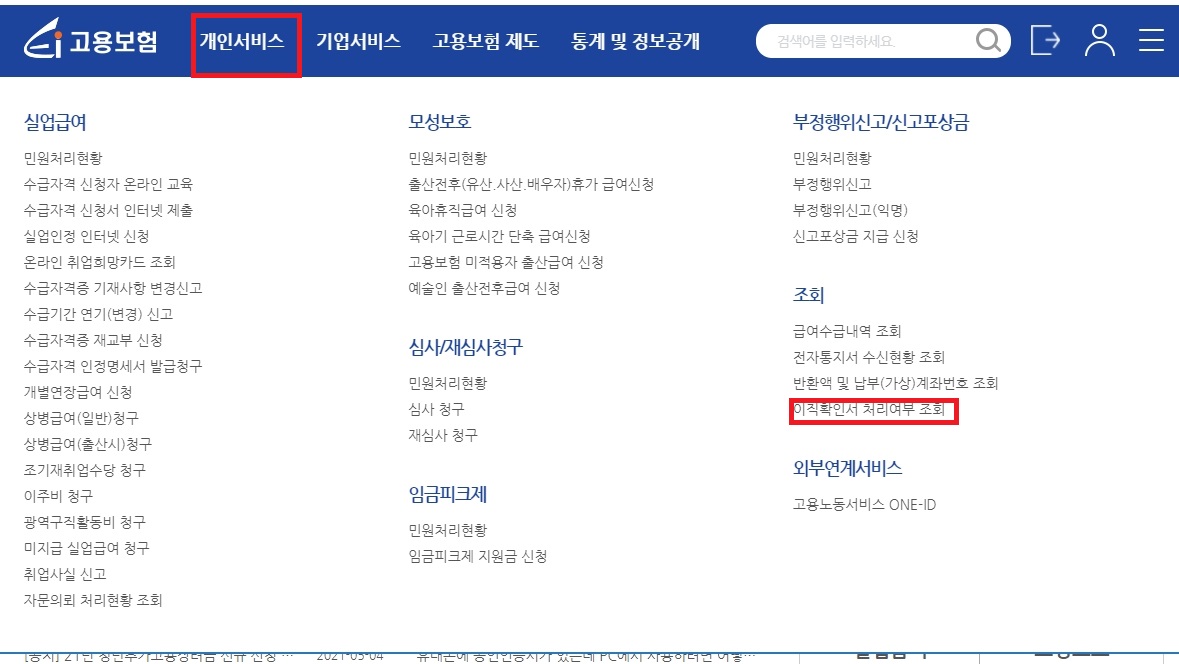 이직확인서 처리 여부를 확인해볼 수 있습니다.