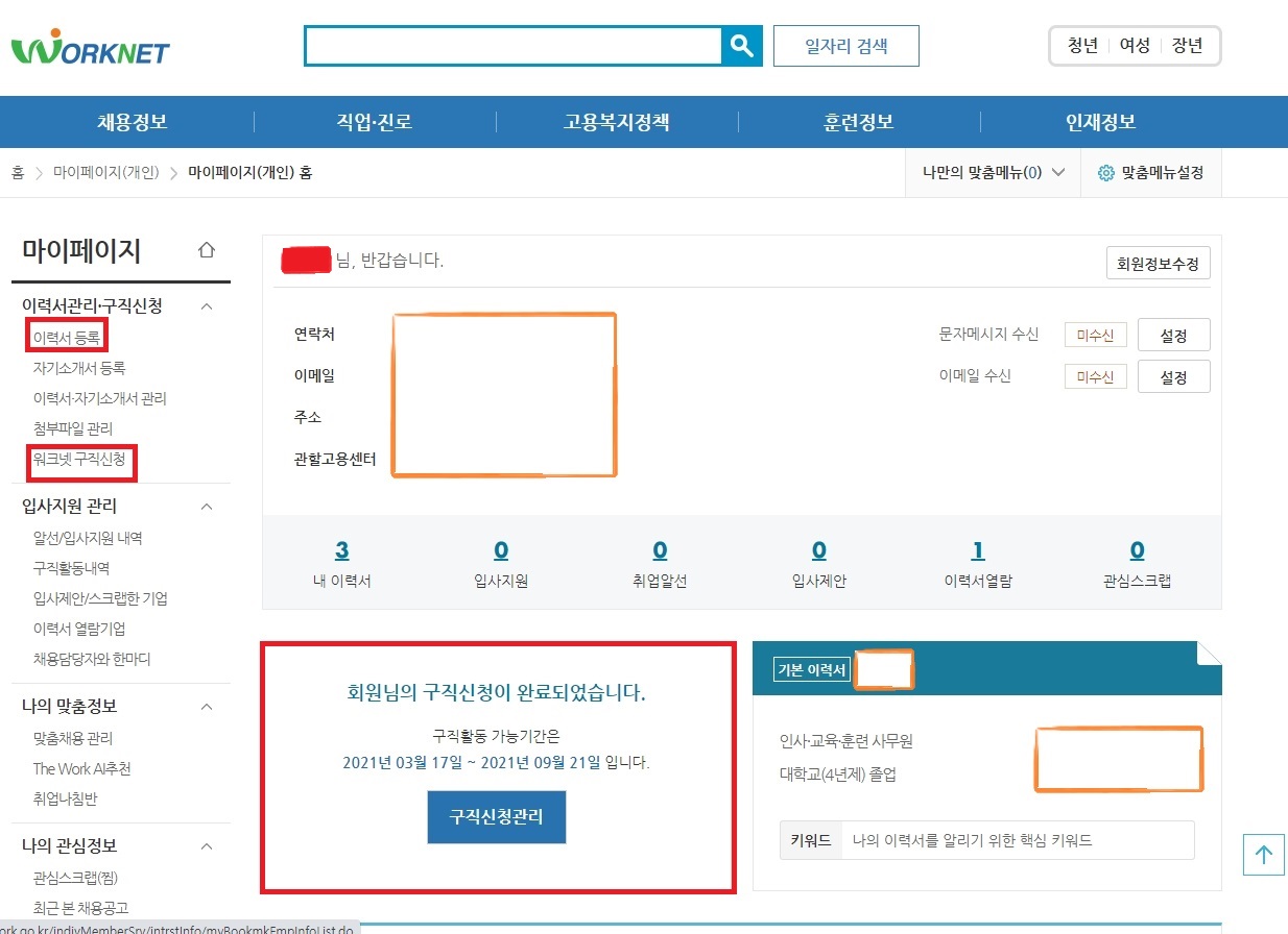 위의 사진에서 마이페이지에 이력서 작성과 아래에 워크넷 구직신청이라고 나옵니다.