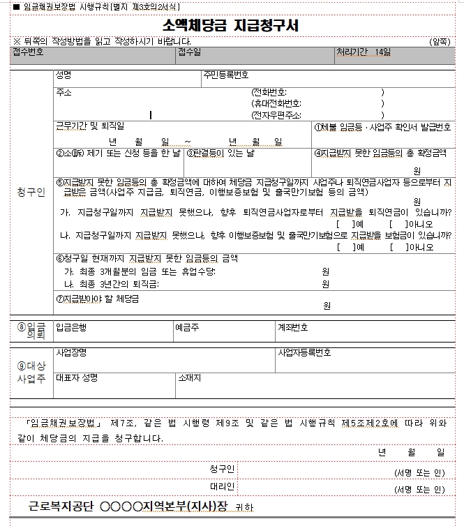 소액체당금 신청의 경우 신청서를 작성하여